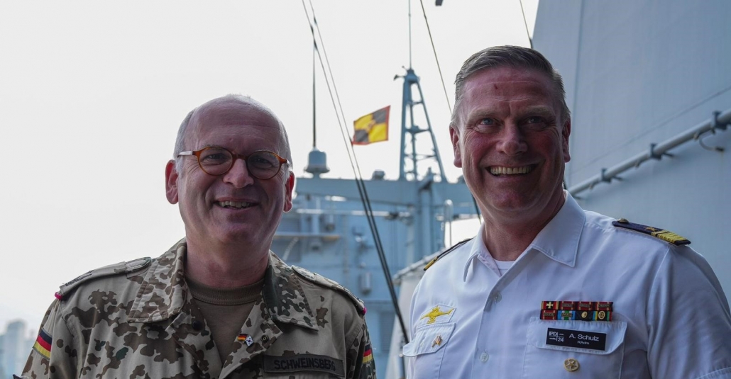Im Rahmen einer Reserveübung tauschte sich Professor Klaus Schweinsberg auf der Fregatte Baden-Württemberg mit Flottillenadmiral Axel Schulz, dem Commander Task Group Einsatzverband Indo-Pacific Deployment (IPD), aus. Der Einsatzverband war auf dem Weg von Korea Richtung Taiwanstraße mit Zwischenziel Singapur, um dann für die Deutsch-Indischen Regierungskonsultationen an einem Manöver mit der Indischen Marine teilzunehmen.